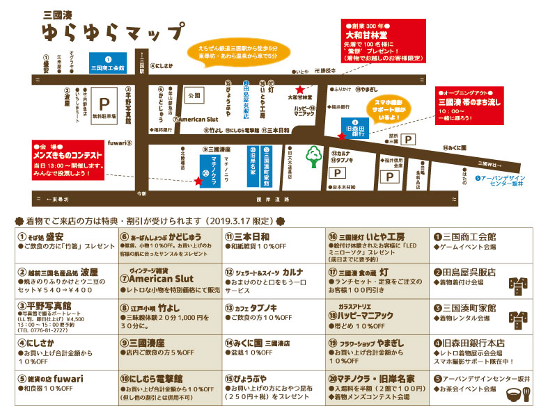 また、当日は20件の協賛店へ着物でお買い物して頂くと特典・割引が受けられます。詳しくは、下記よりダウンロードできます。